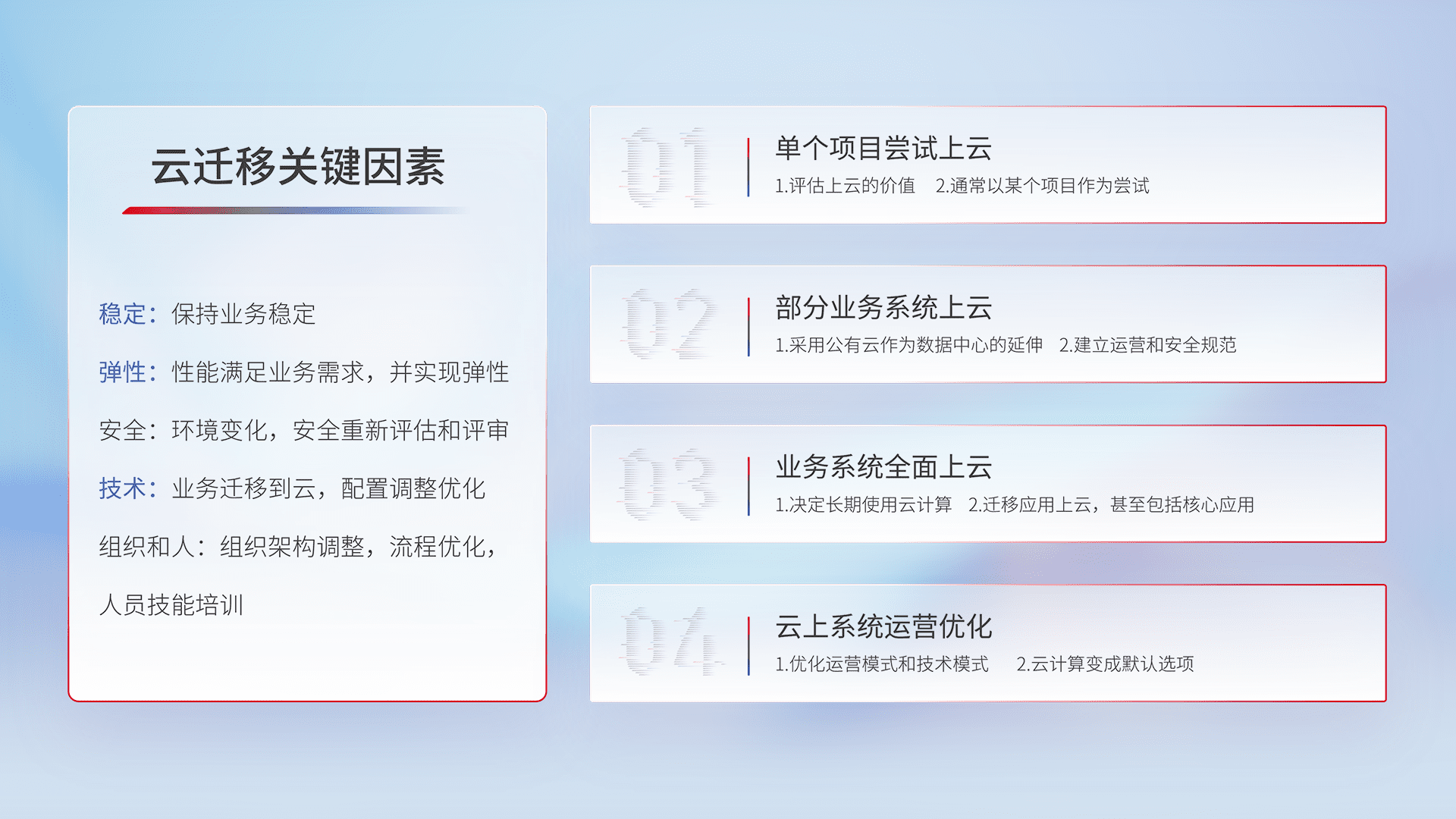 结合实际业务,,,,从规划设计、、、、云平台选型、、云原生改造、、数据迁移、、集成交付,,迁移全过程为客户识别最佳上云路径,,做好风险识别管理,,设计网络架构、、身份权限、、安全审计合规、、、操作审计、、、、日志审计、、、、监控告警策略、、、、多站点容灾设计等,,,对云上基础设施进行整体规划,,,提升IT治理水平,,,,以满足弹性、、、、高可用、、、、高性能的需求。。。