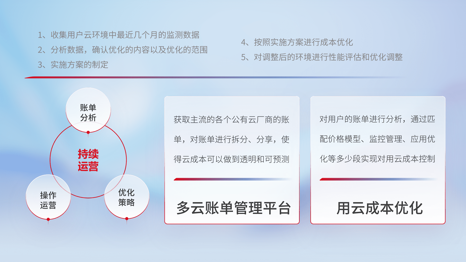 通过多云纳管,,,,以统一的资源数据模型把客户的云资源进行抽象和封装,,,进而实现对多云资源的统一操作,,保障云资源管理的可靠性、、稳定性与可用性。。。量身定制化运维内容,,,,配置、、、、开发运维、、、补丁管理、、备份、、、监控、、、、认证和访问管理、、审计和日常巡检等,,,,保障在用云过程中的可靠度,,,,稳定度以及高可用率。。。